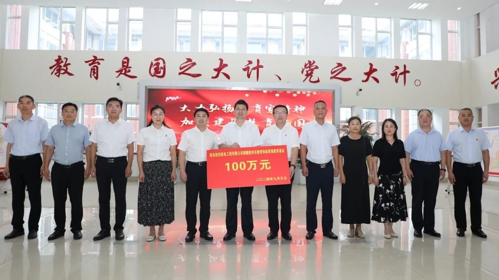 9月5日,在第 40 個教師節來臨之際,青島軟控機電工程有限公司向膠州市教育和體育局捐贈100萬元,儀式在膠州市教育體育局舉行。膠州市委常委、統戰部部長,市政府副市長董如增出席;膠州市教育和體育局黨組書記、局長、市委教育工委常務副書記尹少杰,青島軟控機電工程有限公司總經理武守濤參加儀式并講話。