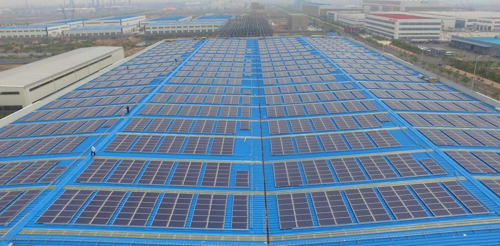 借此機會,青島華控能源牽手青島高新區內的科捷機器人和佳友機械廠,在其房屋頂建設了光伏發電項目作為試點。一塊塊一人多高的矩形太陽能板均勻的排列在廠房屋頂,十分規整,科技感十足,這就是光伏發電裝置。太陽能板平鋪在廠房屋頂既節約了空間,同時也可以讓太陽能板充分接受陽光照射。